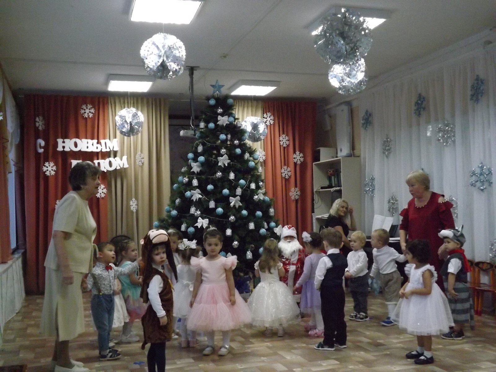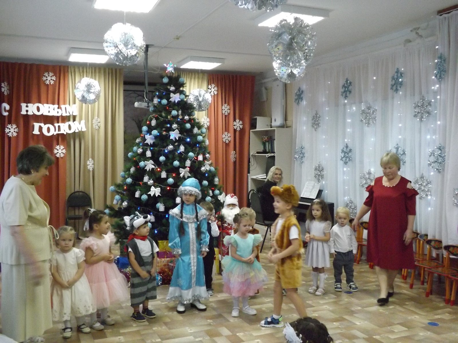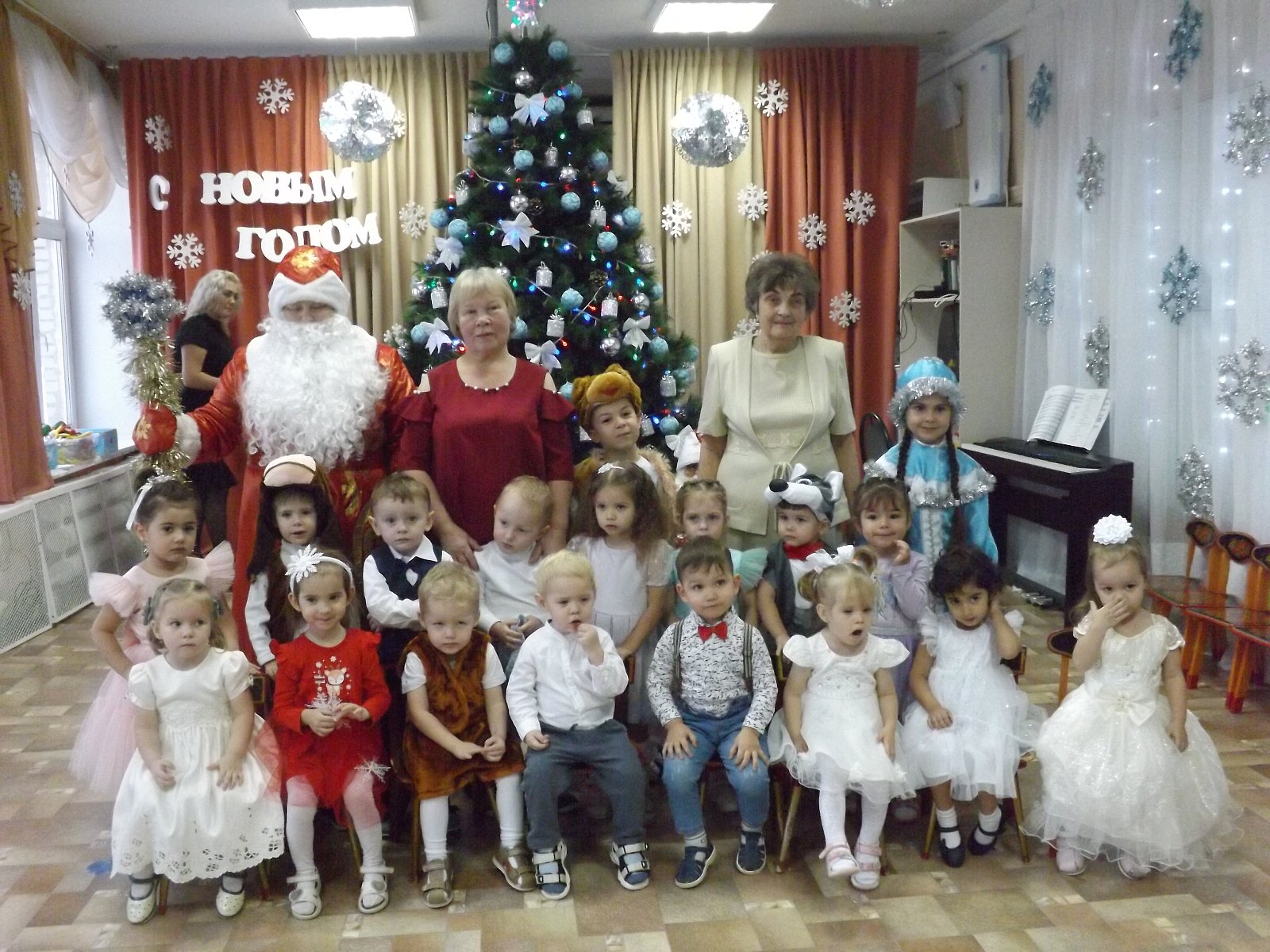 23 декабря в нашем детском саду прошёл самый первый новогодний утренник в первой младшей группе. Малыши пришли нарядные, превратившись в весёлых зайчиков, красивых снежинок. Все закружились в новогоднем хороводе. Малыши веселились у нарядной ёлочки с добрым Дедушкой Морозом, красавицей Снегурочкой и добрым Медвежонком.