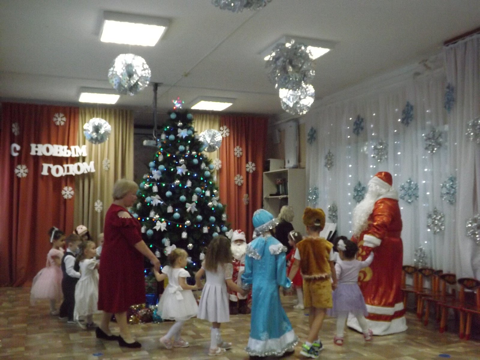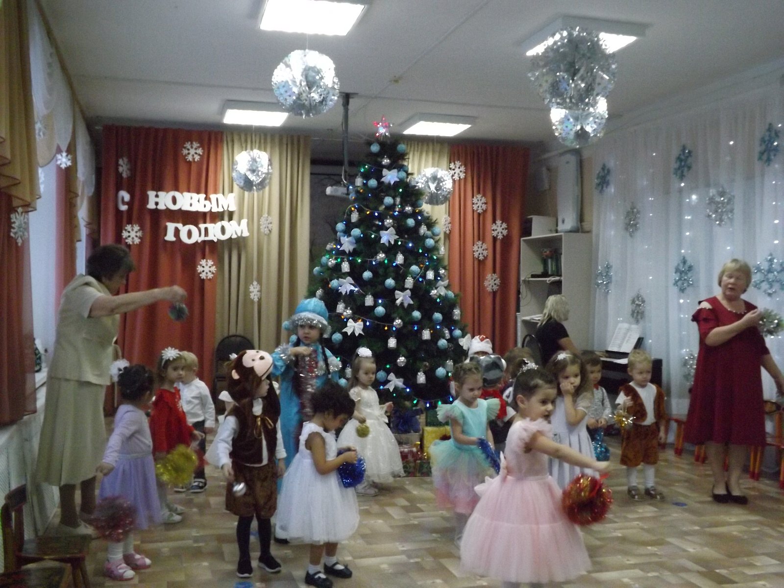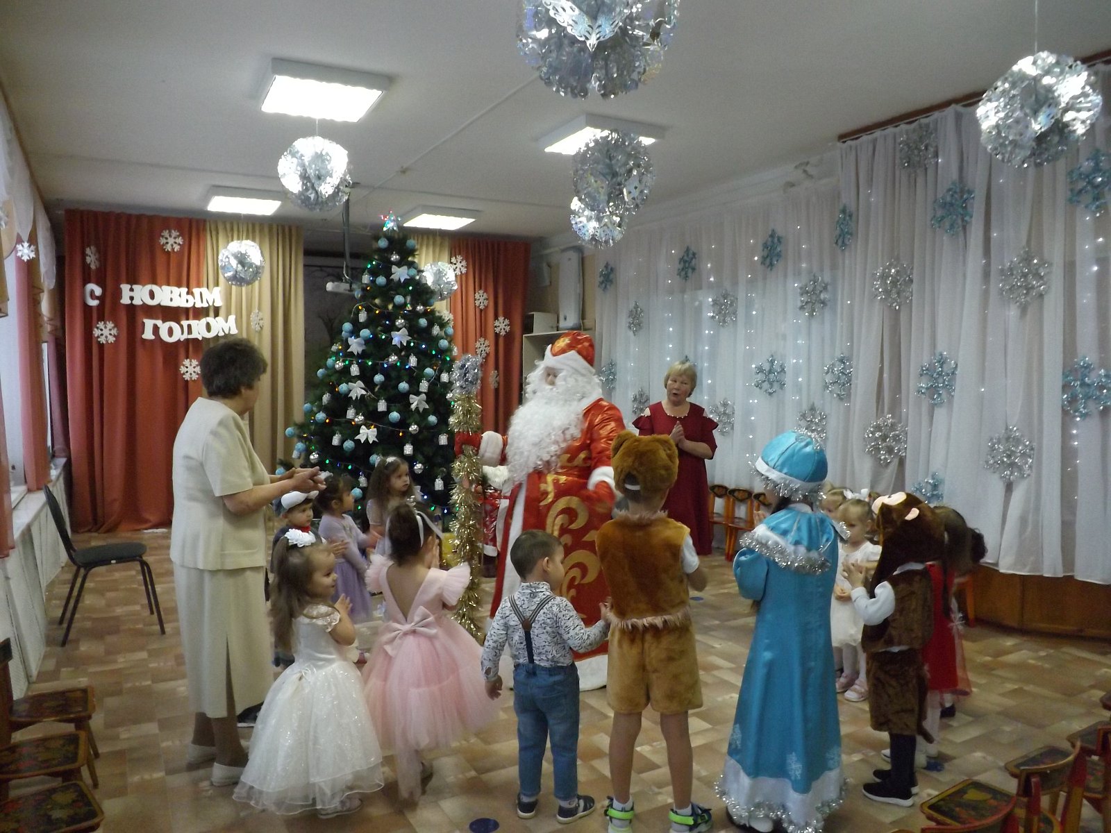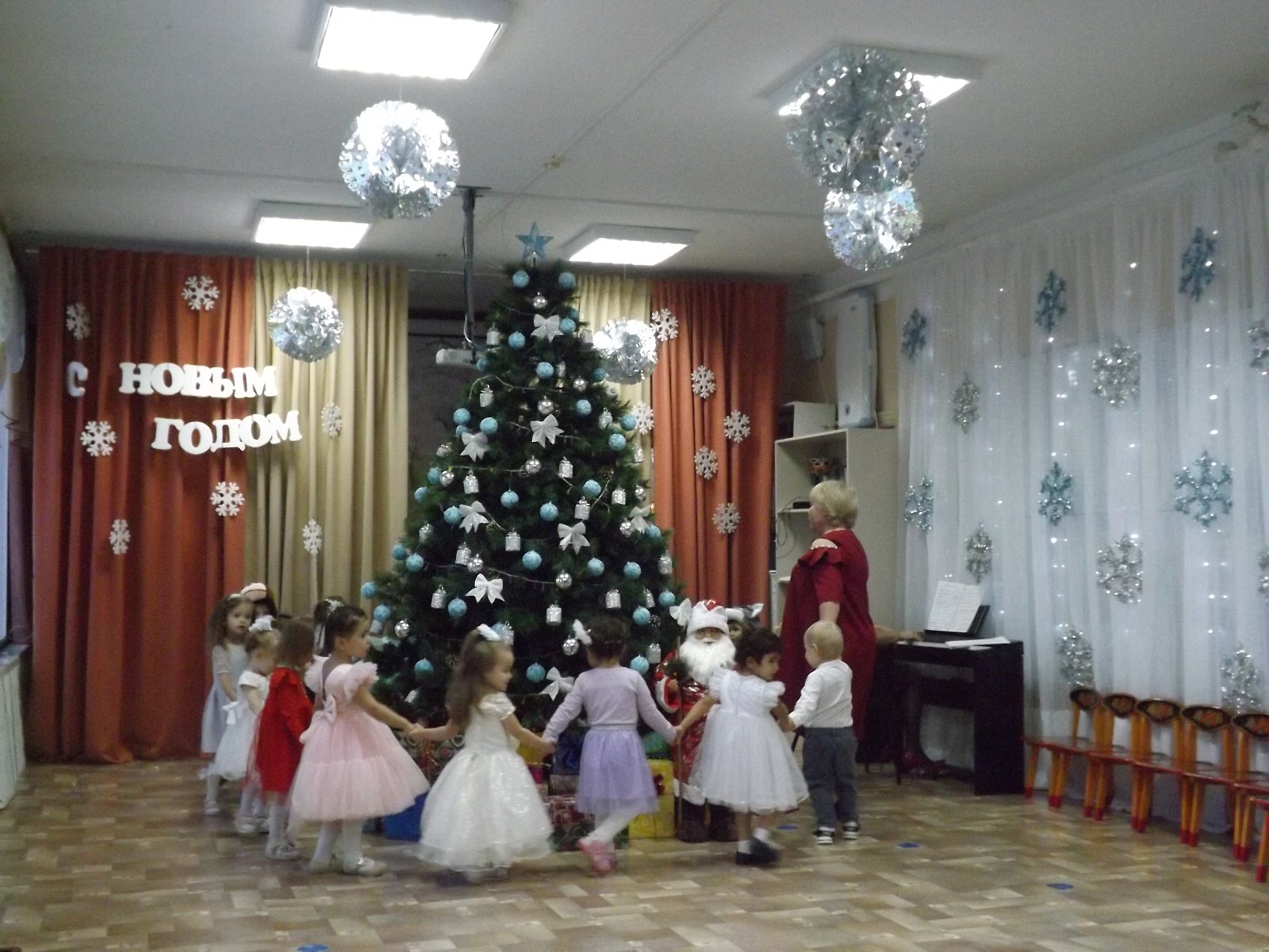 23 декабря в нашем детском саду прошёл самый первый новогодний утренник в первой младшей группе. Малыши пришли нарядные, превратившись в весёлых зайчиков, красивых снежинок. Все закружились в новогоднем хороводе. Малыши веселились у нарядной ёлочки с добрым Дедушкой Морозом, красавицей Снегурочкой и добрым Медвежонком.