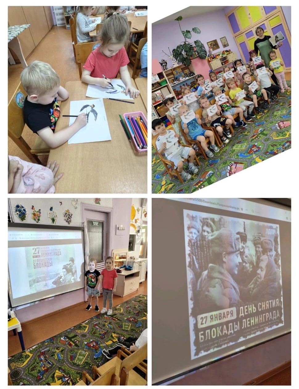 27 января в средней группе "Радуга" и подготовительной группе "Капитошка"прошёл тематический день, посвящённый Дню снятия блокады Ленинграда. В память об этих событиях ребята раскрасили ласточку - символ надежды, добра и мира.