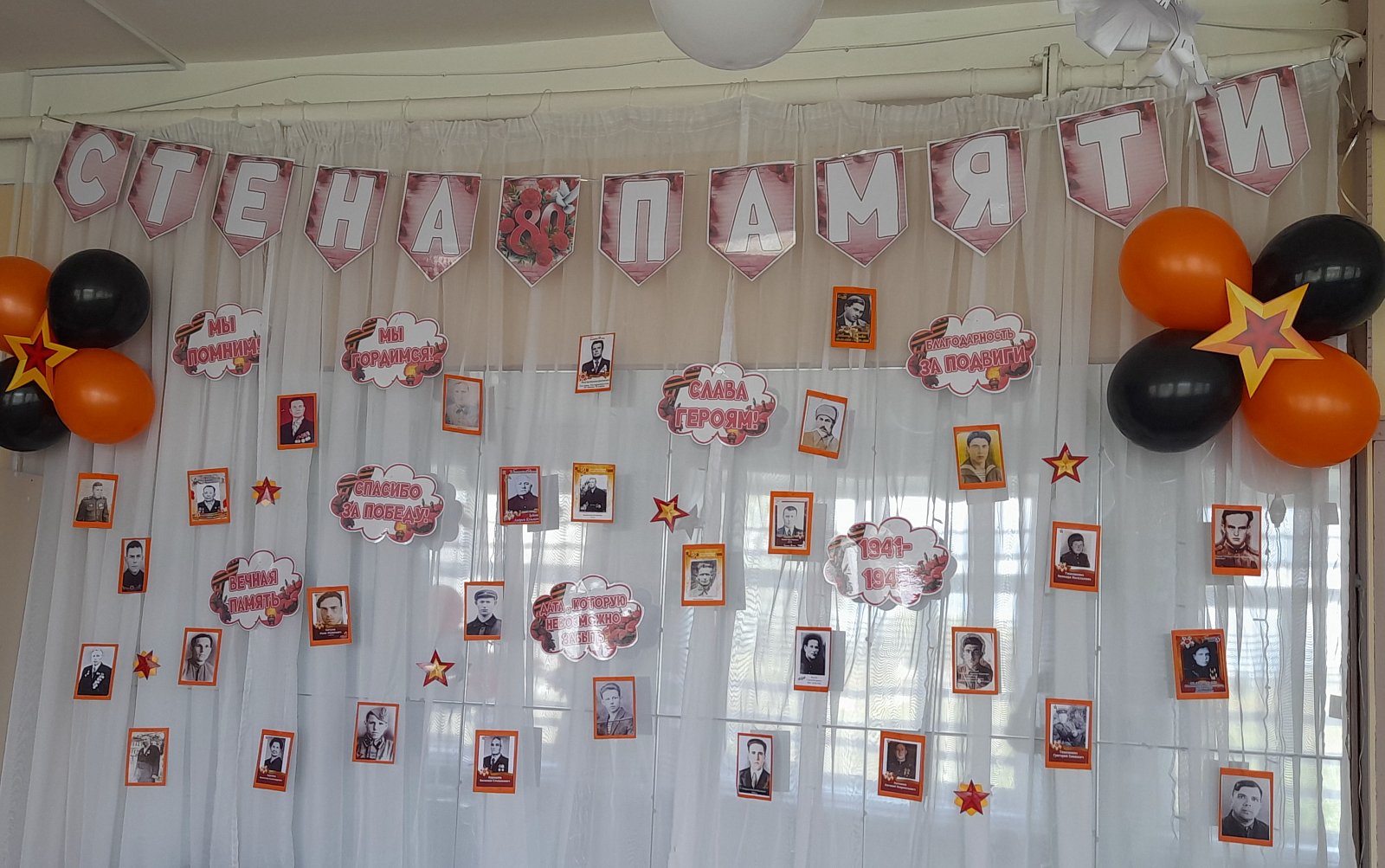 На «Стене Памяти» родители и педагоги совместно с детьми, разместили фотографии своих родственников, прадедушек, прабабушек, тех, кто воевал на линии фронта, и тех, кто в тяжелых условиях работал в тылу, жил в блокаде или на оккупированных фашистами территориях.
